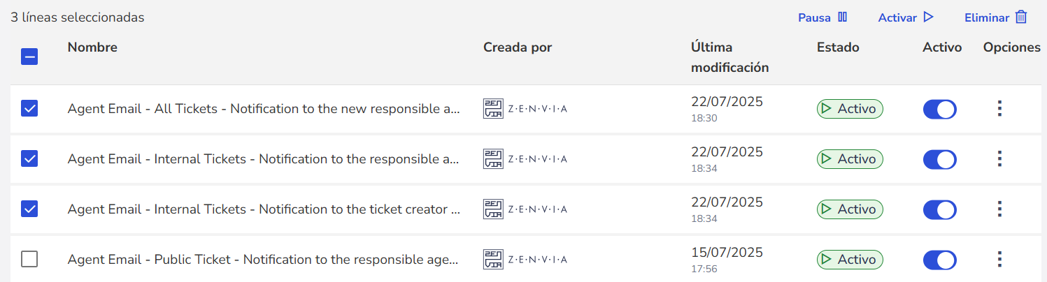 Puedes pausar, activar o eliminar varios agentes a la vez. Para hacerlo: