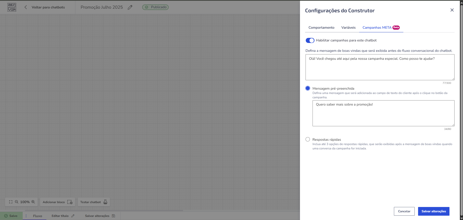 Atención: Si el chatbot ya tiene una campaña activa, para actualizarla es necesario desactivar esa campaña en la plataforma de anuncios de Meta. Después de la desactivación, será posible actualizar la campaña activa en el constructor del chatbot. Si no se desactiva, se mostrará un error al intentar guardar los cambios de la campaña.