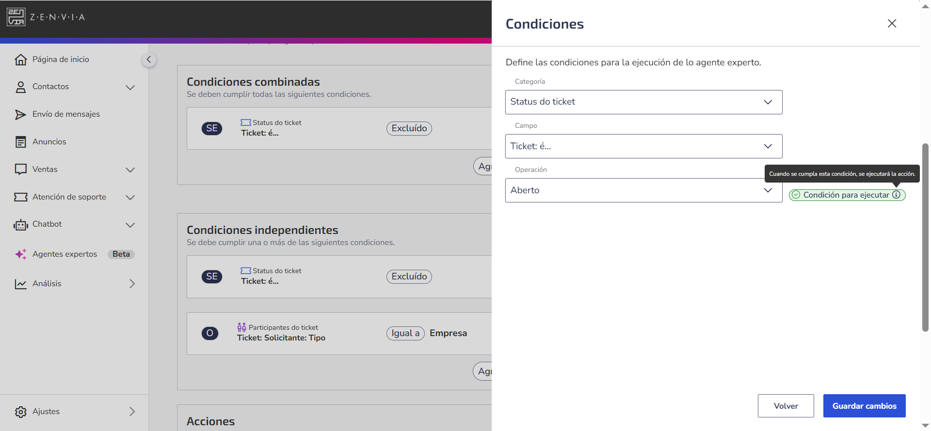Las condiciones son los criterios que determinan cuándo se ejecutará un agente especialista de soporte. Son esenciales para garantizar que las acciones configuradas solo ocurran en contextos específicos y relevantes dentro de un ticket.