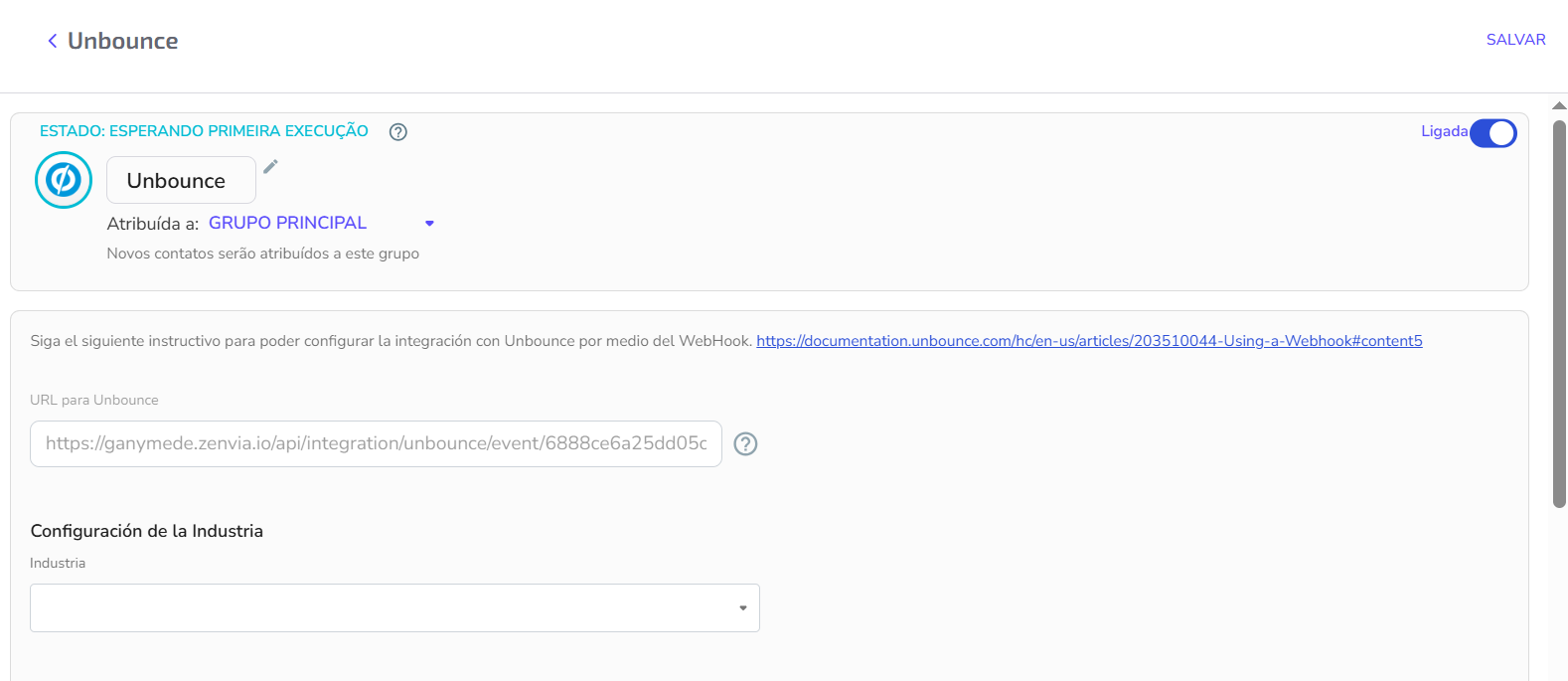 Una vez que el equipo de Unbounce confirme que el Webhook está activo, regresa a Zenvia Customer Cloud y finaliza la configuración.