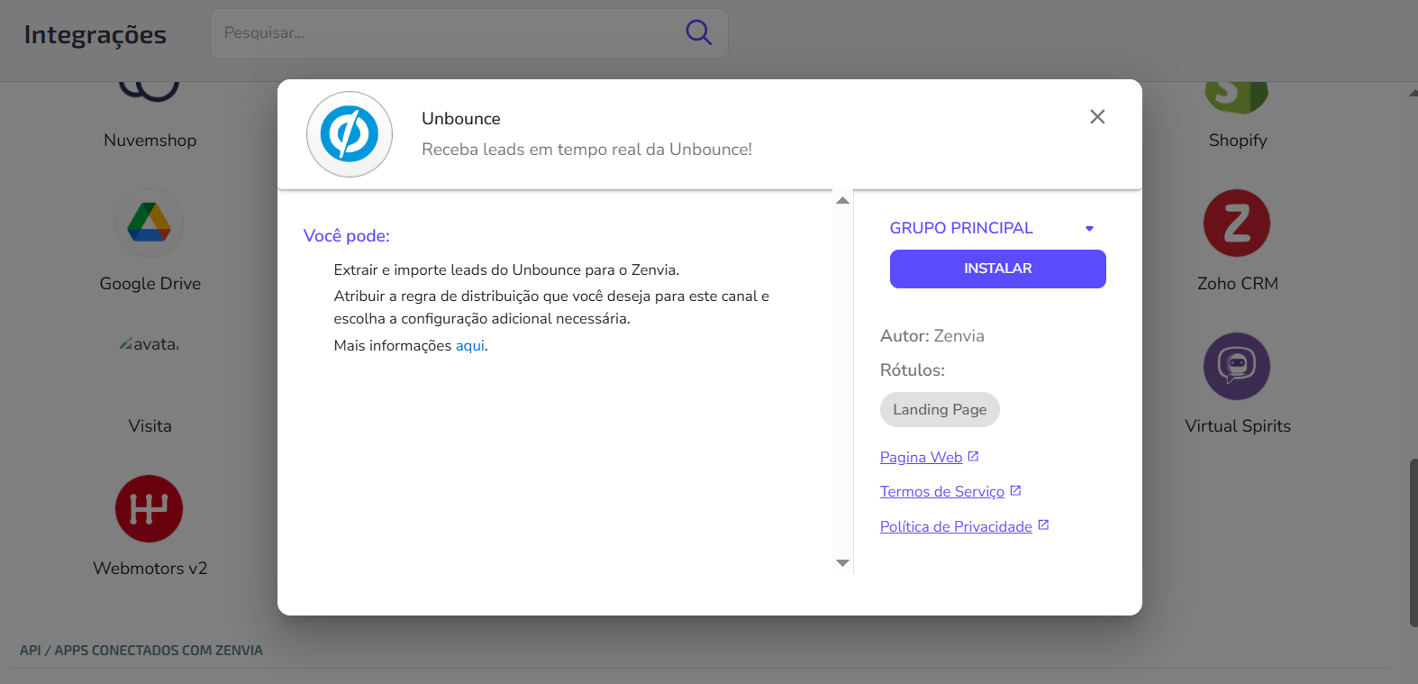 Con la integración activa, todos los leads generados por tus landing pages en Unbounce serán importados automáticamente en Zenvia Customer Cloud, apareciendo en la bandeja de atención comercial del grupo asignado.