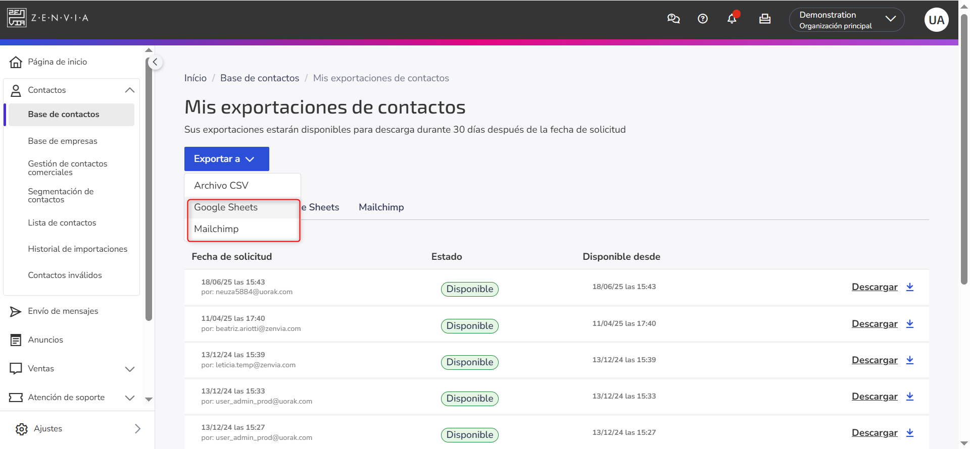 4. Mis exportaciones de contactos (para Mailchimp y Google Sheets)