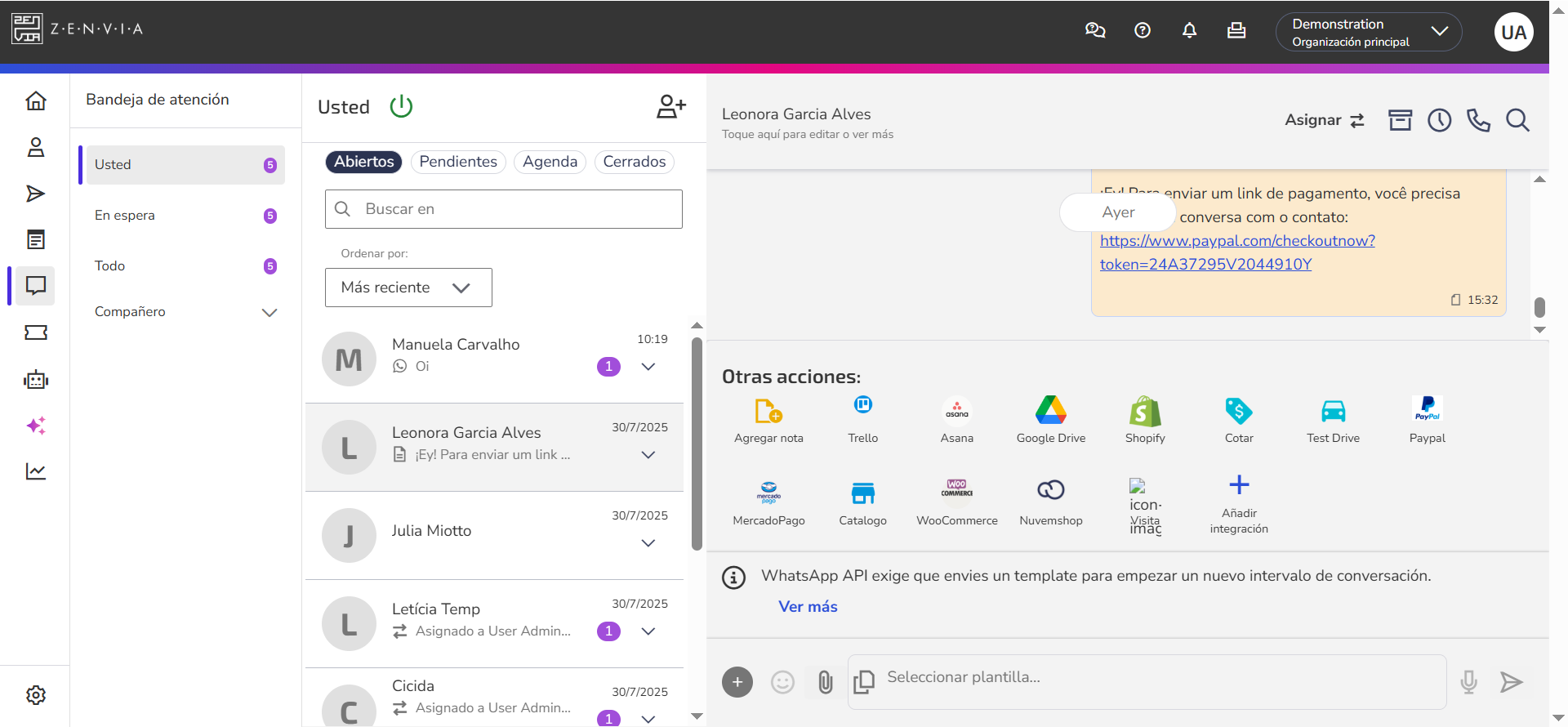 Las integraciones funcionales se utilizan directamente en la bandeja de atención comercial de Zenvia Customer Cloud.