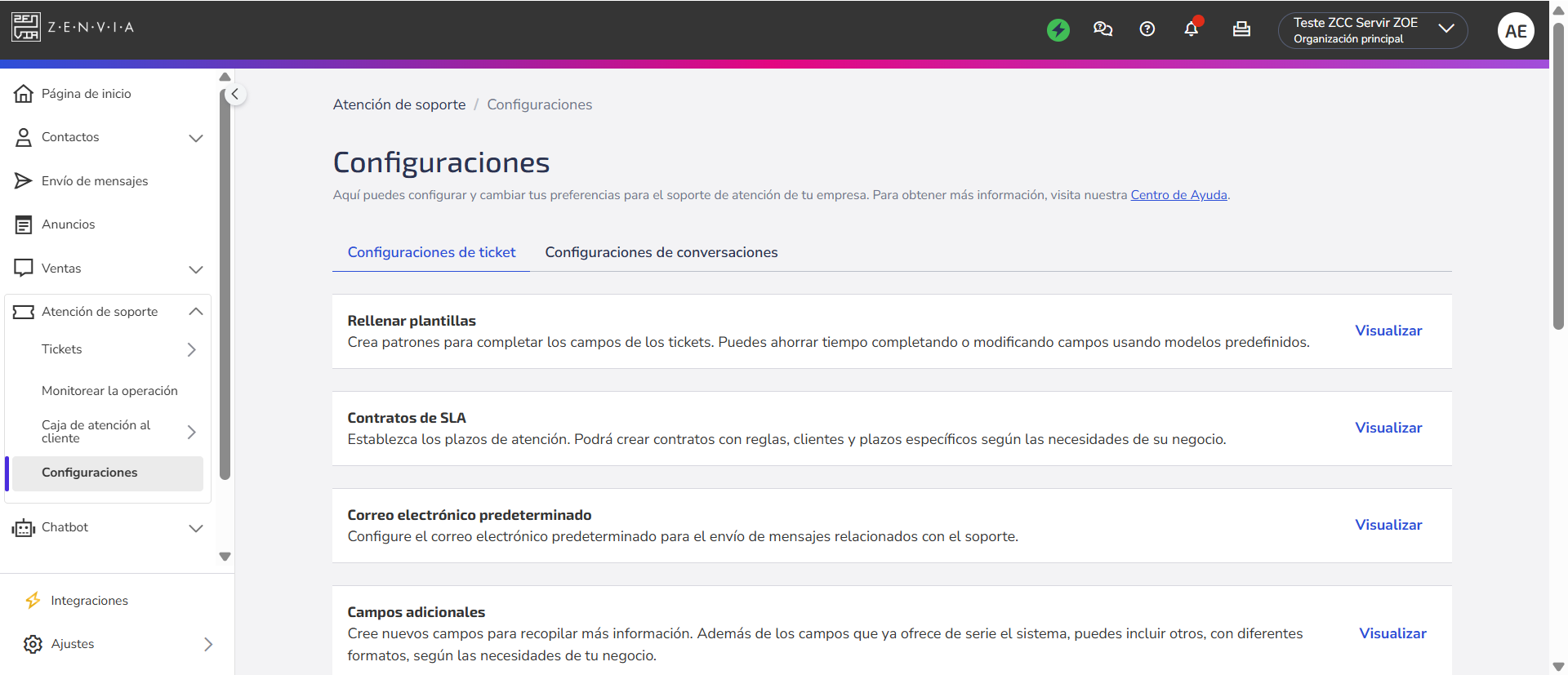 Atención de soporte > Configuraciones > Configuraciones de ticket > Rellenar plantillas > Visualizar.