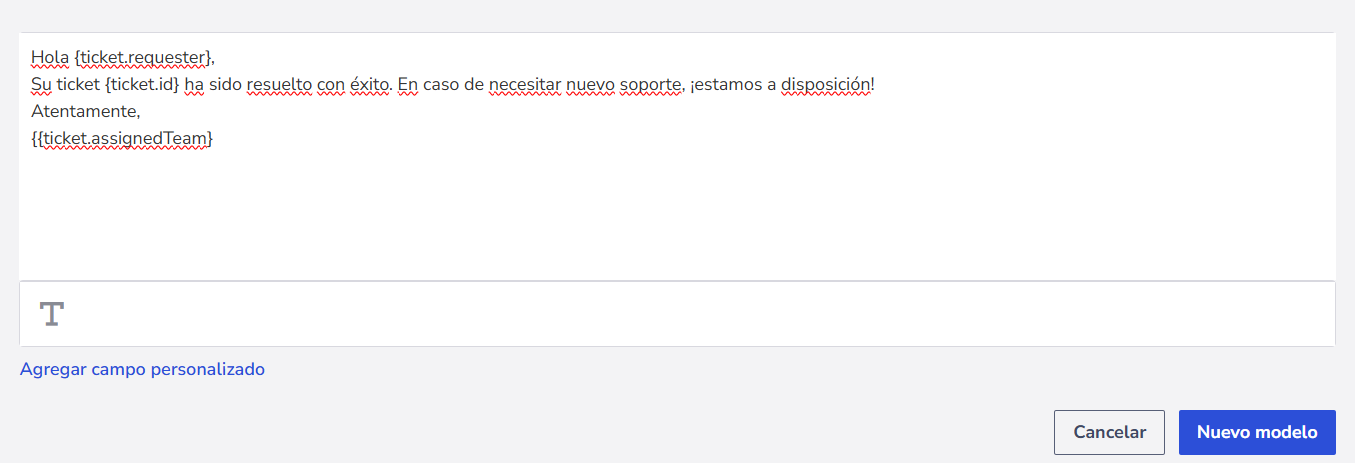 💡 Consejo: Cree una plantilla llamada "Cierre de ticket resuelto" para agilizar el cierre de los tickets. Esta plantilla puede estandarizar el mensaje enviado al cliente, definir automáticamente el estado como resuelto, incluir etiquetas y cambiar el tipo de ticket. Así, los agentes ahorran tiempo y garantizan consistencia en las respuestas y en el registro de los tickets.