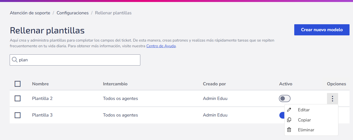 💡Consejo: Solamente las plantillas habilitadas son ejecutadas en los tickets de atención.