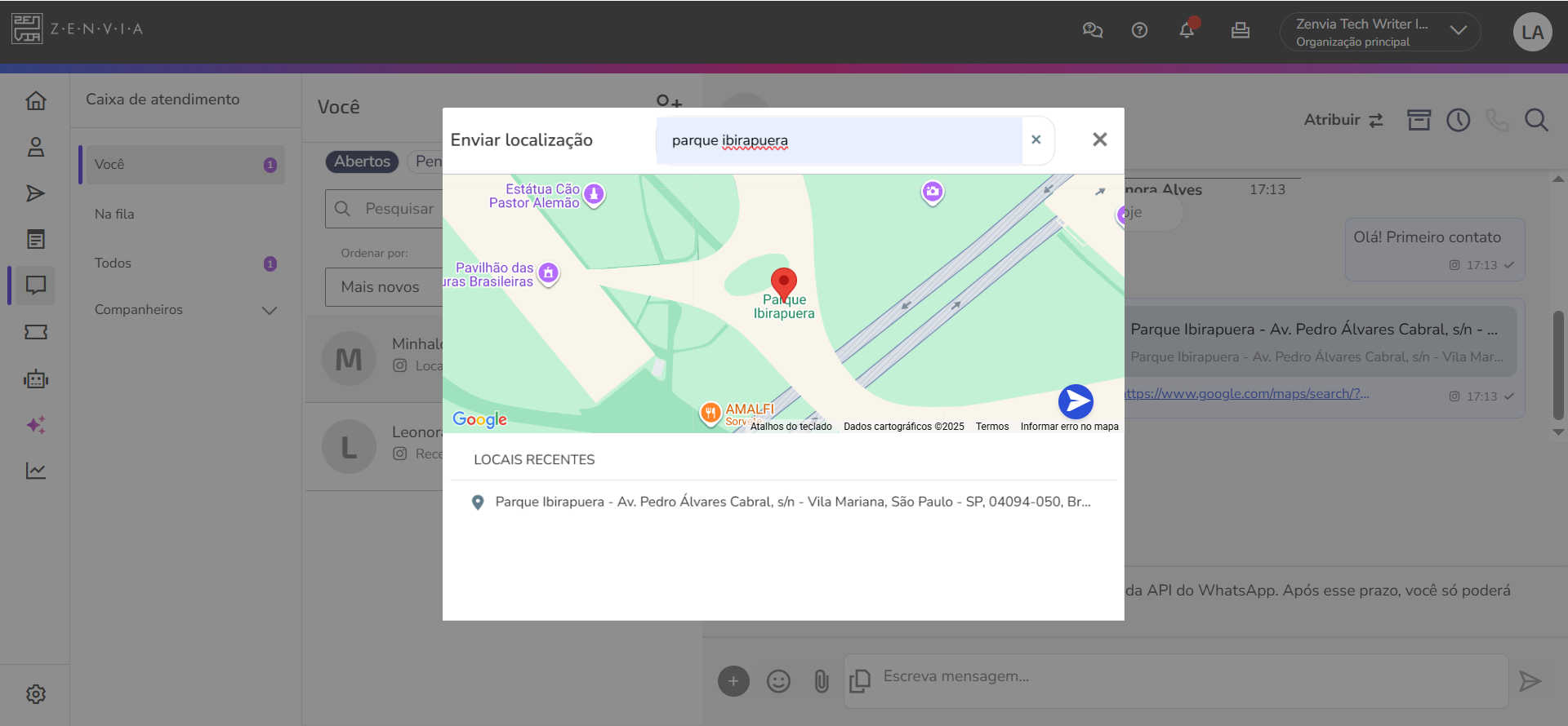 | 💡 Consejo: Es posible enviar la ubicación directamente por el chat de conversación. Basta con hacer clic en el ícono de adjuntos (clips), escribir la dirección o el lugar que desea compartir y enviar. Este recurso es útil para informar la dirección de tiendas, sucursales, puntos de atención o eventos. |