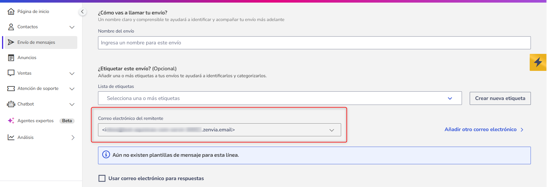 El dominio utilizado en el envío debe ser el mismo dominio vinculado al canal de correo electrónico configurado para atención de soporte. Esto garantiza que, cuando el cliente responda al correo electrónico, el sistema realice la derivación automática al soporte.