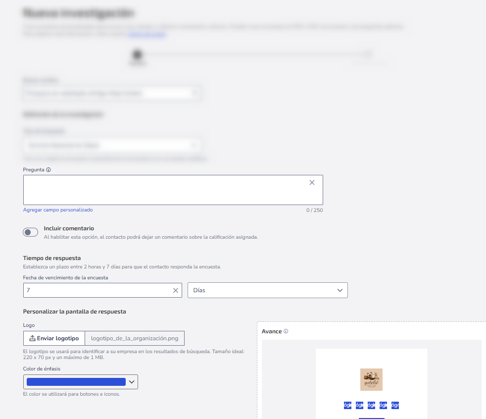 Tipo de encuesta: NPS, CSAT, Acuerdo o Pregunta abierta.