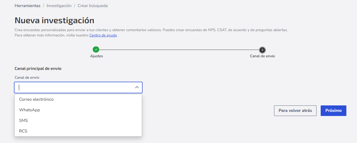 Tipo de encuesta: NPS, CSAT, Acuerdo o Pregunta abierta.