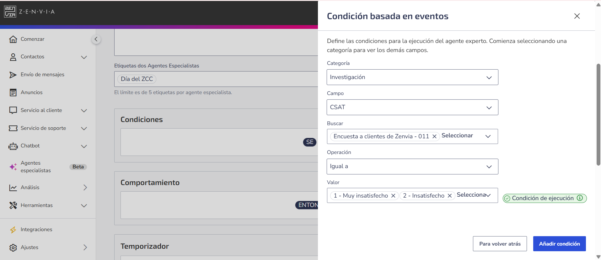 💡Tip: En las condiciones basadas en eventos, también puede usar la categoría "Encuestas" para crear acciones automáticas. Por ejemplo, si recibe una nota baja, puede programar un desvío (transferencia) automático a un agente humano para gestionar la insatisfacción:
