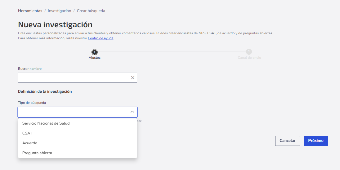 Tipo de encuesta: NPS, CSAT, Acuerdo o Pregunta abierta.