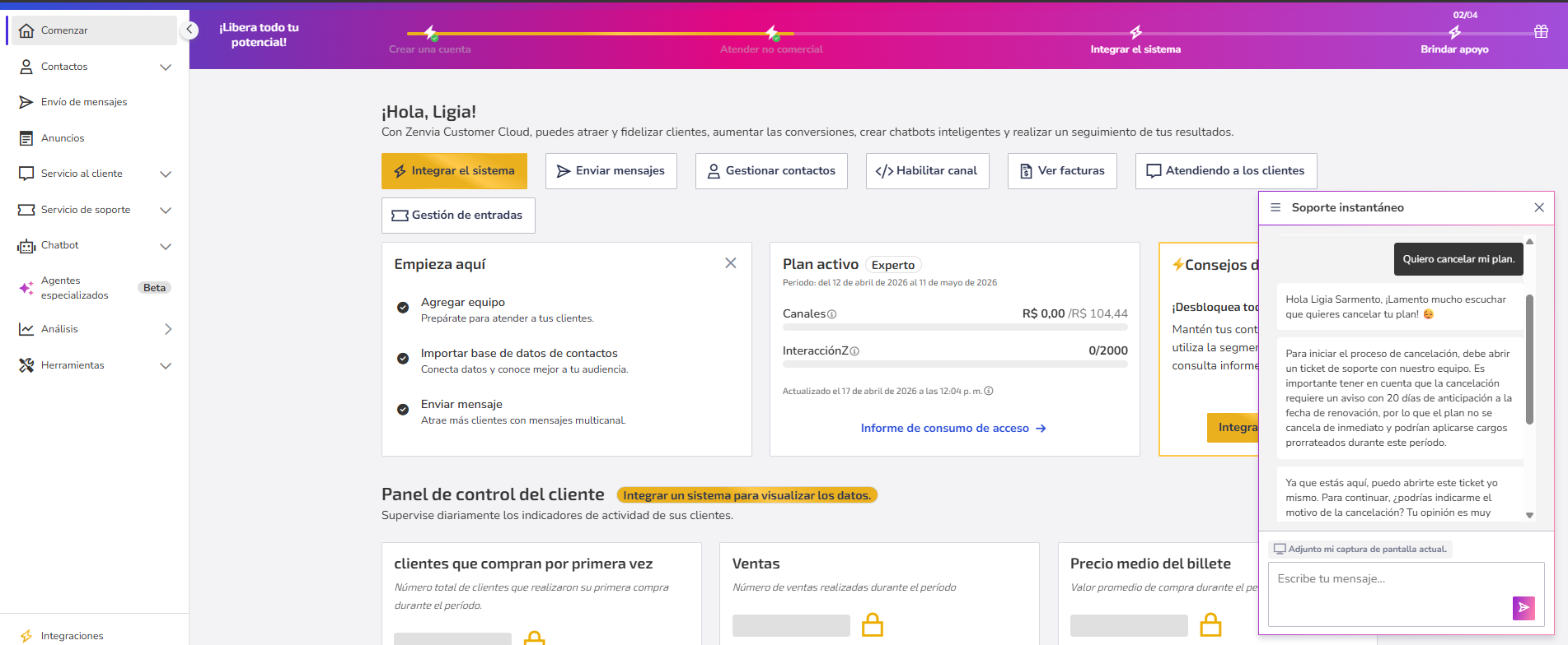 Si deseas cancelar tu plan de Zenvia Customer Cloud, puedes realizar la solicitud directamente a través del Soporte Instantáneo disponible en la App Zenvia. El proceso es sencillo: solo tienes que iniciar un chat e informar tu pedido de cancelación. La solicitud será enviada al equipo encargado, que le dará seguimiento al proceso.